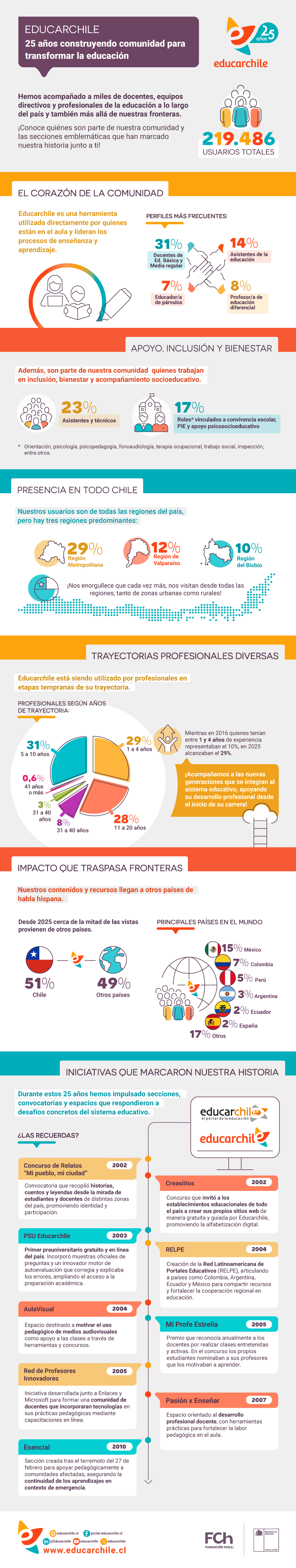 Ya conoces más de nuestra comunidad ¡pero eso no es todo! En este año tan especial para Educarchile, hemos preparado una infografía con datos que podrán sorprenderte y hacerte recordar momentos significativos en tu trayectoria profesional. Descárgala aquí y sigue acompañándonos estos meses conmemorativos tan especiales para nosotros.
